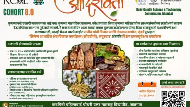 आदिवासी युवक-युवतींच्या नाविन्यपूर्ण कल्पनांना चालना देण्यासाठी आणि त्यांना यशस्वी स्टार्टअप्समध्ये रूपांतरित करण्यासाठी KCIIL (Khandesh Center for Innovation, Incubation & Linkages) आणि CADP – Silage Based Area Development Program यांच्या संयुक्त विद्यमाने ‘आदिशक्ती’ हा विशेष इनक्युबेशन कार्यक्रम सुरू करण्यात आला आहे.