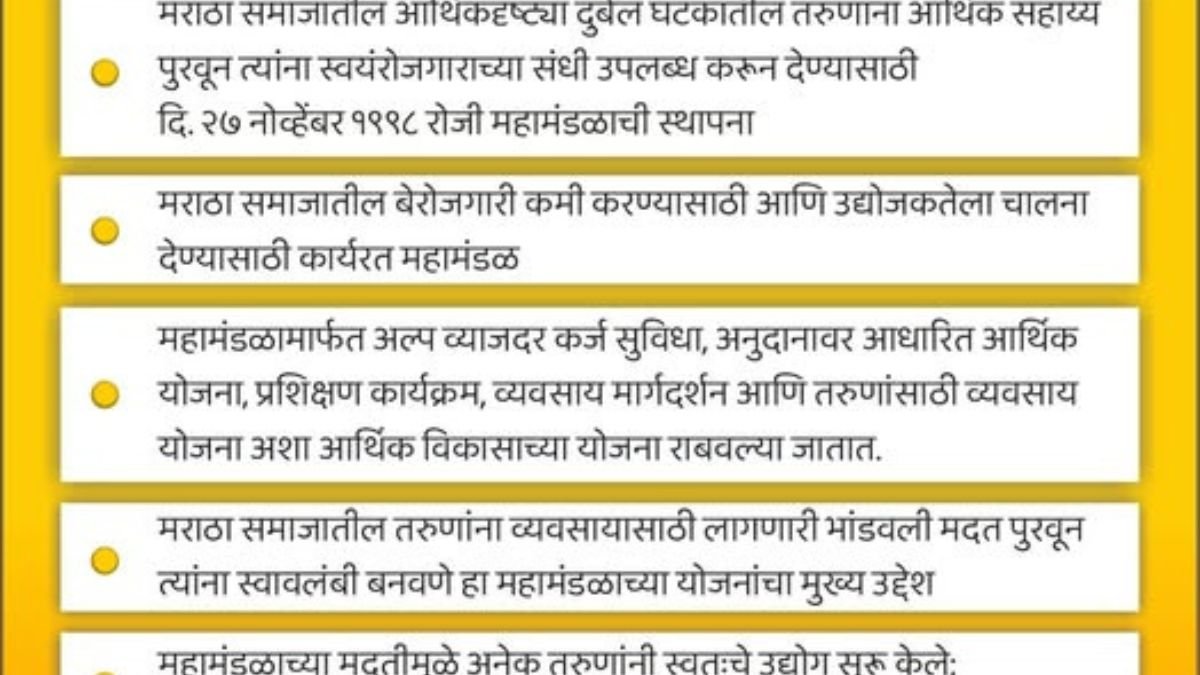 महाराष्ट्र व्यवसायातून उन्नतीसाठी ‘अण्णासाहेब पाटील आर्थिक मागास विकास महामंडळ’… November 18, 2025 annasaheb-patil-economically-backward-development-corporation-for-advancement-through-business प्रामुख्याने मराठा समाजातील आर्थिकदृष्ट्या दुर्बल घटकांतील तरुण-तरुणींना आर्थिक सहाय्य पुरवून त्यांना स्वयंरोजगाराच्या संधी उपलब्ध करून देण्यासाठी हे महामंडळ कार्यरत आहे.