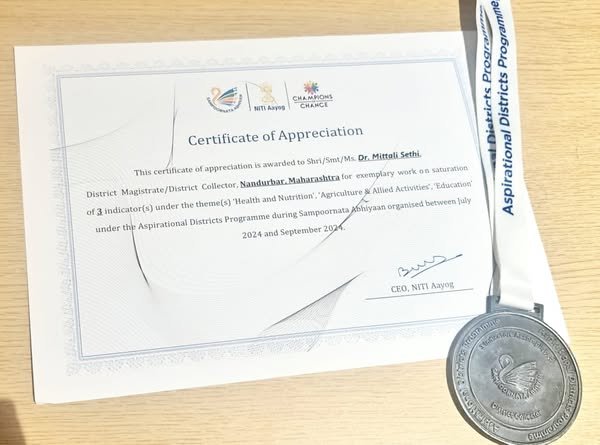 मा. जिल्हाधिकारी डॉ. मित्ताली सेठी यांच्या मार्गदर्शनाखाली निती आयोगाच्या संपूर्णता अभियानात नंदुरबार जिल्ह्याने ३ प्रमुख निर्देशांकांवर ‘संपृक्तता’ (saturation) गाठली, तर अक्राणी तालुक्याने ४ निर्देशांकांवर परिणामकारक कामगिरी केली. या यशस्वी प्रयत्नांबद्दल मा. मुख्यमंत्री देवेंद्र फडणवीस यांच्या हस्ते जिल्हाधिकारी डॉ. मित्ताली सेठी यांना कॉपर व ब्रॉन्झ पदक प्रदान करून सन्मानित केले.