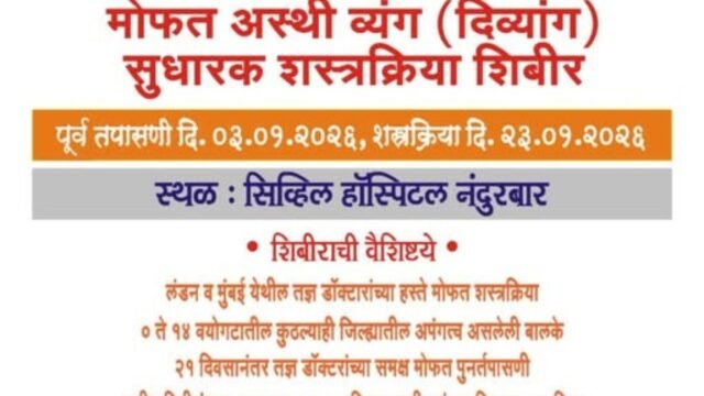 ० ते १४ वयोगटातील अस्थिव्यंग (दिव्यांग) बालकांसाठी मोफत तपासणी व सुधारक शस्त्रक्रिया करण्याच्या उद्देशाने दिनांक ०३ जानेवारी २०२६ रोजी विशेष शिबिराचे आयोजन करण्यात आले आहे.