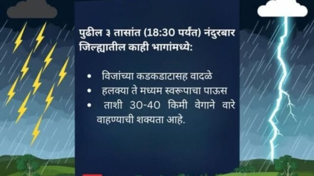 पुढील ३ तासांत नंदुरबार जिल्ह्यामध्ये काही ठिकाणी विजांच्या कडकडाटासह वादळे आणि हलक्या ते मध्यम स्वरूपाच्या पावसासह ताशी ३०-४० किमी वेगाने वारे वाहण्याची शक्यता आहे नागरिकांनी सतर्क राहावे.