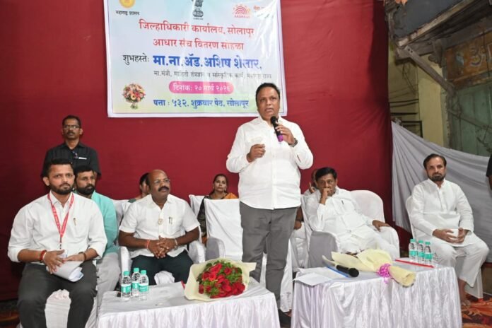 मंत्री ॲड. शेलार यांनी पुढे सांगितले की, शासनाने माहिती तंत्रज्ञानाचा वापर करून १००० सेवा थेट नागरिकांच्या व्हॉट्सअॅपवर उपलब्ध करून देण्याचा प्रयत्न सुरू आहे. सोलापूर जिल्ह्यातील १३१ आधार केंद्रांपैकी १०६ किट वितरित झाले असून, प्रतिनिधिक स्वरूपात पाच किट आज देण्यात आले. उर्वरित २५ किट एप्रिल-मे महिन्यात वितरित करण्यात येणार आहेत.उत्तर तहसीलदार निलेश पाटील यांनी आधार संचाबद्दल माहिती देऊन सांगितले की, या किटमुळे आधार नोंदणी करताना कमीत कमी अडचणी येतील आणि कामकाज अधिक सुलभ होण्यास मदत होणार आहे.या कार्यक्रमास आमदार सुभाष देशमुख, माजी जिल्हा परिषद अध्यक्ष शहाजी पवार, मोहन डांगरे, तहसीलदार निलेश पाटील तसेच इतर पदाधिकारी, आधार केंद्र चालक व कर्मचारी उपस्थित होते.
