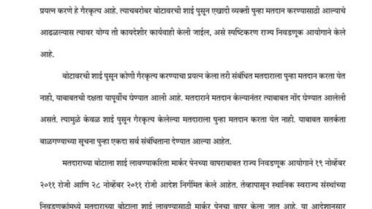 मतदाराच्या बोटाला शाई लावण्याकरिता मार्कर पेनच्या वापराबाबत राज्य निवडणूक आयोगाने १९ नोव्हेंबर २०११ रोजी आणि २८ नोव्हेंबर २०११ रोजी आदेश निर्गमित केले आहेत. तेव्हापासून स्थानिक स्वराज्य संस्थांच्या निवडणुकांमध्ये मतदाराच्या बोटाला शाई लावण्यासाठी मार्कर पेनचा वापर केला जात आहे.