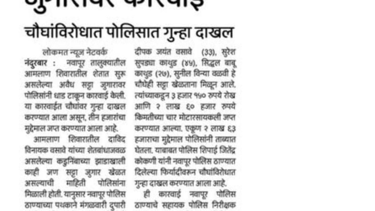 Navapur police took action at two different places involved in gambling and illegal liquor transportation/sale and registered a case against a total of 10 people.