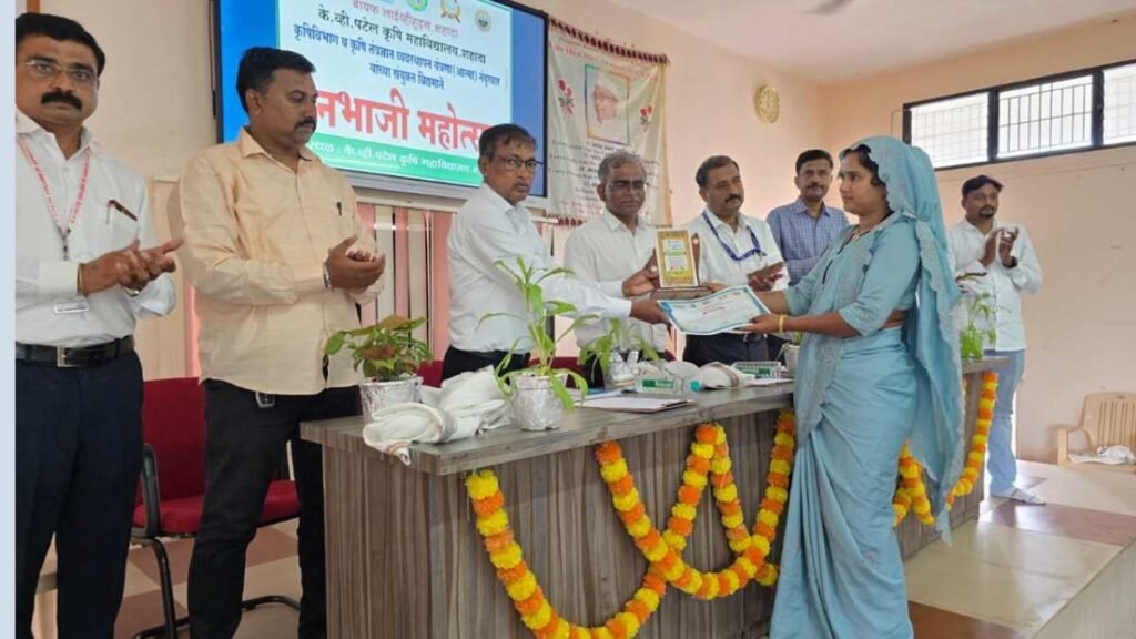 (शहादा)– पारंपरिक अन्नसंस्कृती व आरोग्य संवर्धनाला चालना देण्यासाठी शहादा येथील के. व्ही. पटेल कृषि महाविद्यालयात ‘रानभाजी महोत्सव’ मोठ्या उत्साहात पार पडला. महिला बचत गटांचा सक्रिय सहभाग नोंदवत ४३ रानभाज्यांचे नमुने मांडण्यात आले, तर या महोत्सवाला २४२ शेतकऱ्यांची उपस्थिती लाभली.