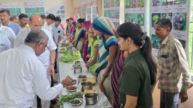 (शहादा)– पारंपरिक अन्नसंस्कृती व आरोग्य संवर्धनाला चालना देण्यासाठी शहादा येथील के. व्ही. पटेल कृषि महाविद्यालयात ‘रानभाजी महोत्सव’ मोठ्या उत्साहात पार पडला. महिला बचत गटांचा सक्रिय सहभाग नोंदवत ४३ रानभाज्यांचे नमुने मांडण्यात आले, तर या महोत्सवाला २४२ शेतकऱ्यांची उपस्थिती लाभली.