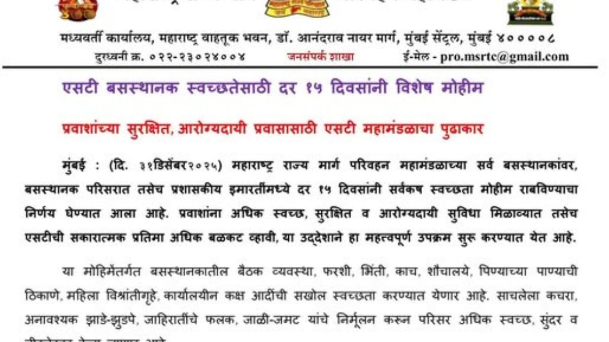 १५ दिवसांनी सर्वंकष स्वच्छता मोहीम राबविण्याचा निर्णय घेण्यात आला आहे. प्रवाशांना अधिक स्वच्छ, सुरक्षित व आरोग्यदायी सुविधा मिळाव्यात तसेच एसटीची सकारात्मक प्रतिमा अधिक बळकट व्हावी, या उद्देशाने हा महत्त्वपूर्ण उपक्रम सुरू करण्यात येत आहे.