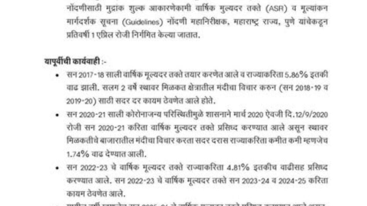 दरांमध्ये कोणतीही वाढ करण्यात आलेली नाही. सन २०२५-२६ मधील दरच सन २०२६-२७ साठी कायम ठेवण्यात आले असून, यामुळे बांधकाम व्यावसायिकांसह घरखरेदीदारांनाही मोठा दिलासा मिळणार आहे.