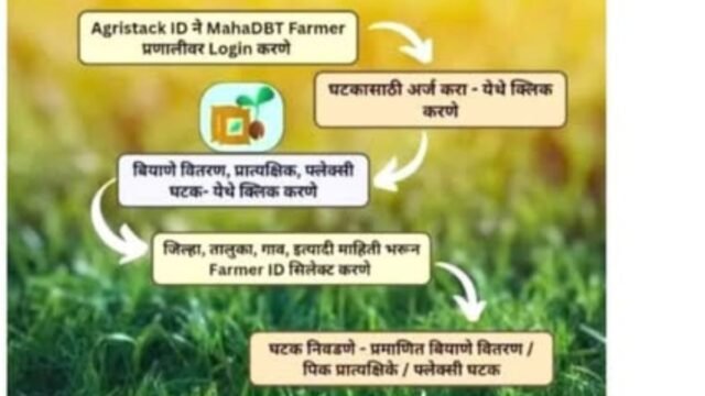 MahaDBT पोर्टलवर लॉगिन करून → घटक निवड → बियाणे वाटप → पिक प्रकार → क्षेत्र तपशील → अर्ज सादर करा.