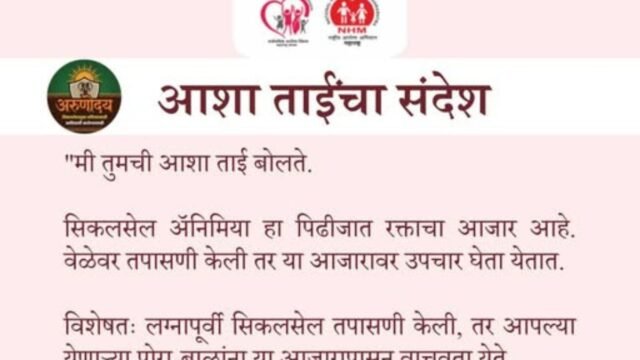 महाराष्ट्र शासनाच्या ‘अरुणोदय’ सिकलसेल अॅनिमिया विशेष मोहिमेंतर्गत १५ जानेवारी ते ७ फेब्रुवारी २०२६ मोफत तपासणी, उपचार व समुपदेशनाची सुविधा उपलब्ध आहे.