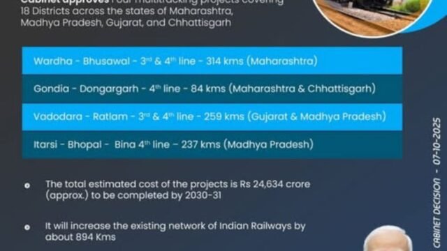 बडोदा – रतलाम – तिसरी आणि चौथी लाईन 259 किमी (गुजरात आणि मध्य प्रदेश) आणि इटारसी भोपाळ बीना चौथी लाईन 237 किमी (मध्य प्रदेश) आहे. महाराष्ट्र, मध्य प्रदेश, गुजरात आणि छत्तीसगड या राज्यांमधील 18 जिल्ह्यांतील भारतीय रेल्वेचे विद्यमान जाळे 894 किमीने वाढणार आहे.