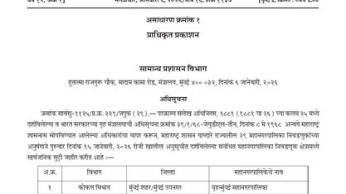 औद्योगिक आणि वाणिज्यिक आस्थापनांना गुरुवार, दिनांक १५ जानेवारी २०२६ रोजी भरपगारी सुट्टी जाहीर करण्यात आली आहे.