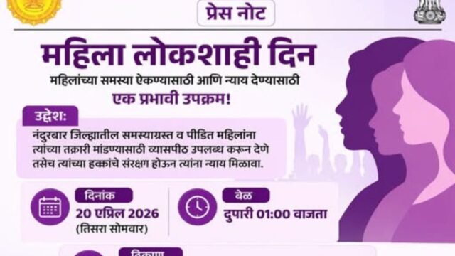त्याअनुषंगाने एप्रिल महिन्यात दिनांक २० एप्रिल २०२६ रोजी दुपारी १.०० वाजता महिला लोकशाही दिनाचे आयोजन करण्यात आले आहे.