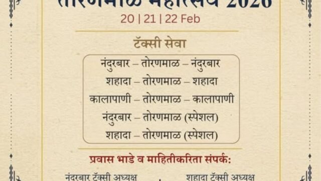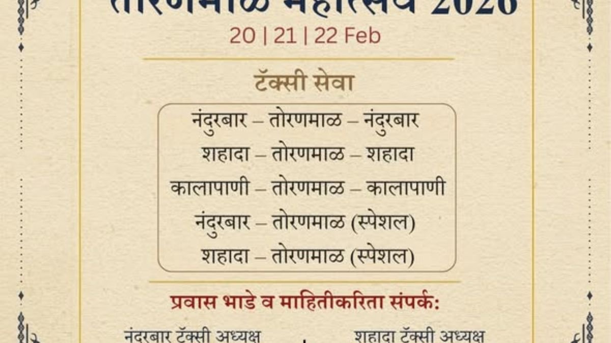 ‘तोरणमाळ महोत्सव 2026’ हा दिनांक 20, 21 आणि 22 फेब्रुवारी 2026 रोजी उत्साहात साजरा होणार असून महोत्सवासाठी राज्यभरातून मोठ्या संख्येने पर्यटक उपस्थित राहणार आहेत. पर्यटकांच्या सुरक्षित व सुकर प्रवासासाठी विशेष प्रवास व्यवस्था जाहीर करण्यात आली आहे.