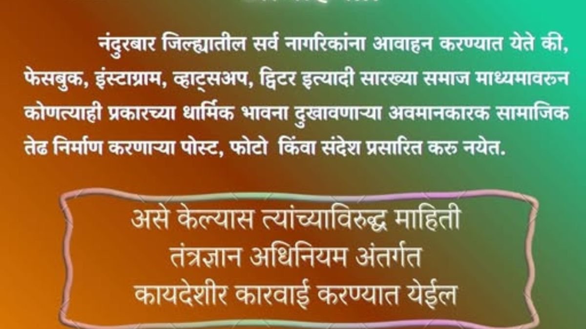कुणाच्याही धार्मिक भावना दुखावेल अशी कोणतीही पोस्ट सोशल मिडियावर प्रसारित करू नका, अन्यथा कठोर कायदेशीर कार्यवाही करण्यात येईल.
